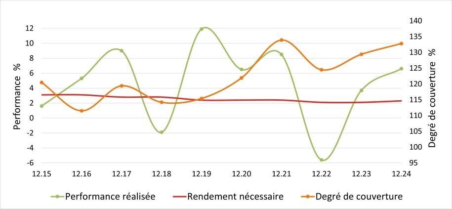 Qui sommes-nous Nous, la Caisse de pensions Migros, nous considérons comme le centre de compétences pour la prévoyance professionelle au sein du groupe Migros. Communications La CPM en bref Direction Compte rendu de l'exercice Vue d'ensemble des chiffres durabilité Histoire Inscription pour CPM-flash Vue d'ensemble des chiffres-clés 2024202320222021 Ensemble des assurés 79'02780'48680'21280'989 dont actifs 49'06350'81350'87551'660 dont passifs 29'96429'67329'33729'329Employeurs affiliés 41373838 Placements en capitaux mio. CHF 29'444.128'232.627'624.029'744.7Performance % 6.63.7-5.68.5 Degré de couverture % 132.8129.4124.5133.9Fonds libres / Déficit de la réserve (-) mio. CHF 2'935.82'187.81'172.93'184.8 Frais d'administration mio. CHF 6.68.18.07.6Frais d'administration par personne CHF 82.9100.499.194.2 Performance et degré de couverture 2015201620172018201920202021202220232024 %%%%%%%%%% Performance réalisée1.65.39.0-1.911.96.58.5-5.63.76.6Performance attendue3.12.62.42.42.24.12.83.23.23.3 3.12.62.42.42.24.12.83.2 3.2Rendement nécessaire3.13.12.82.82.42.42.42.12.12.3 3.13.12.82.82.42.42.42.1 2.1Degré de couverture120.5111.5119.4114.2115.4121.9133.9124.5129.4132.8